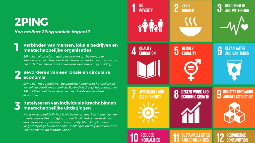 With social challenges 2Ping becomes the connection between residents and social initiatives / local businesses who want to create impact in: 1. Healthy & fresh food 2. Sustainable and affordable energy 3. Clean and safe South-East