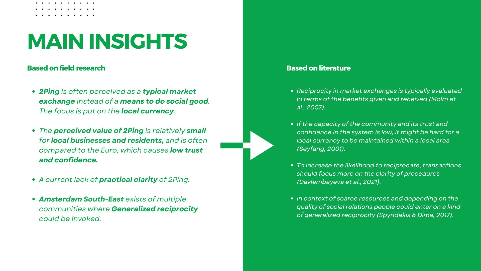 The main insights were presented to the 2Ping team alongside supporting literature research. By combining design ethnography with academic research on reciprocity, a deeper understanding was developed of how local currencies are perceived. This approach highlighted potential tensions between 2Ping’s current focus on market exchanges and perceived market value, and the broader goals of community building and reciprocity
