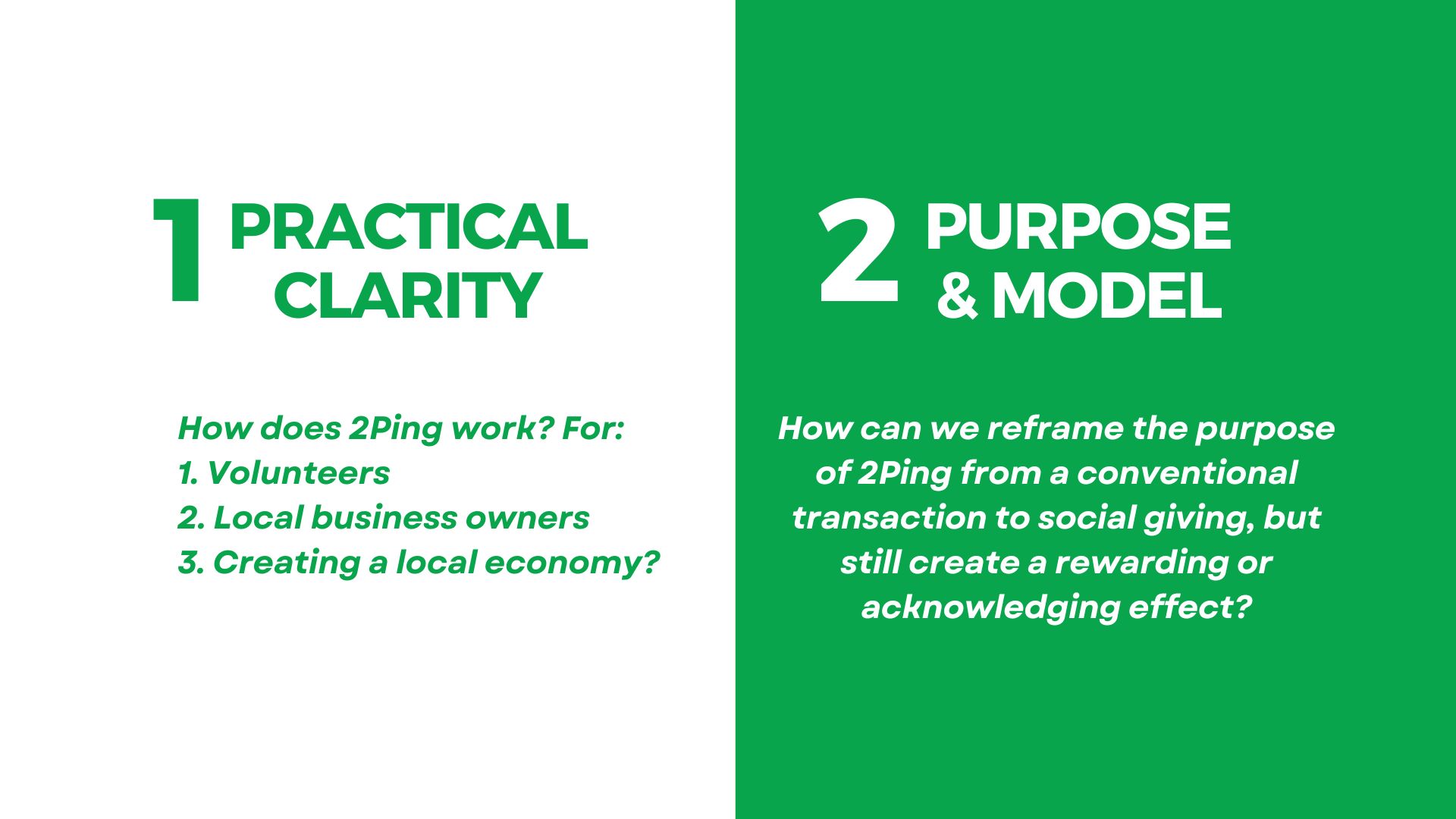 Project aim: re-framing and re-designing 2Ping, and incorporates strategy alignment with a new purpose that shifts the focus from value in a commodity to value in community building.