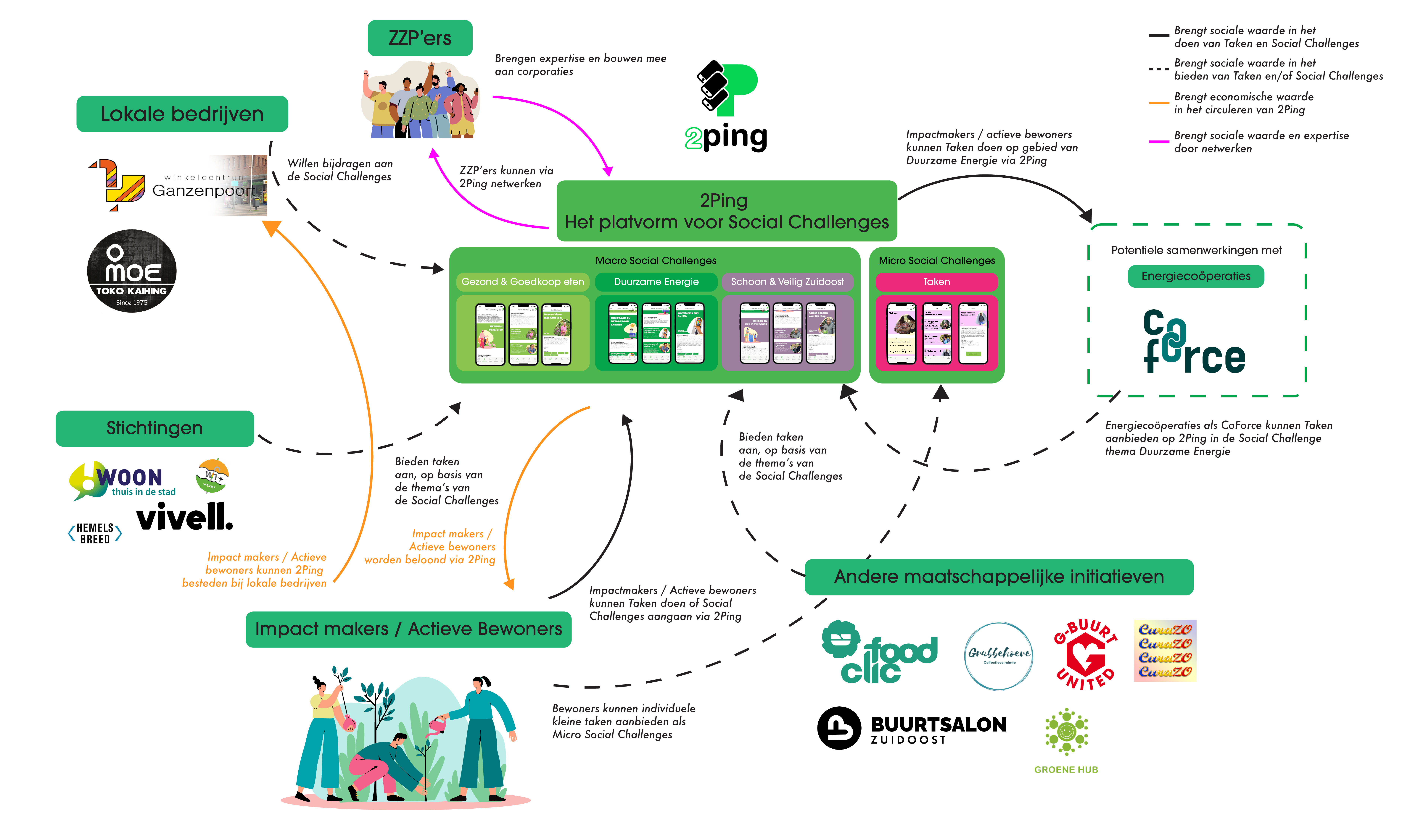 The map highlights the social and economic value created through collaborations with key stakeholders—including residents, entrepreneurs, local businesses, and foundations. It also demonstrates the potential of resident-led initiatives to engage the public sector, showcasing how 2Ping can facilitate dynamic value exchanges and foster community building in Amsterdam Southeast.