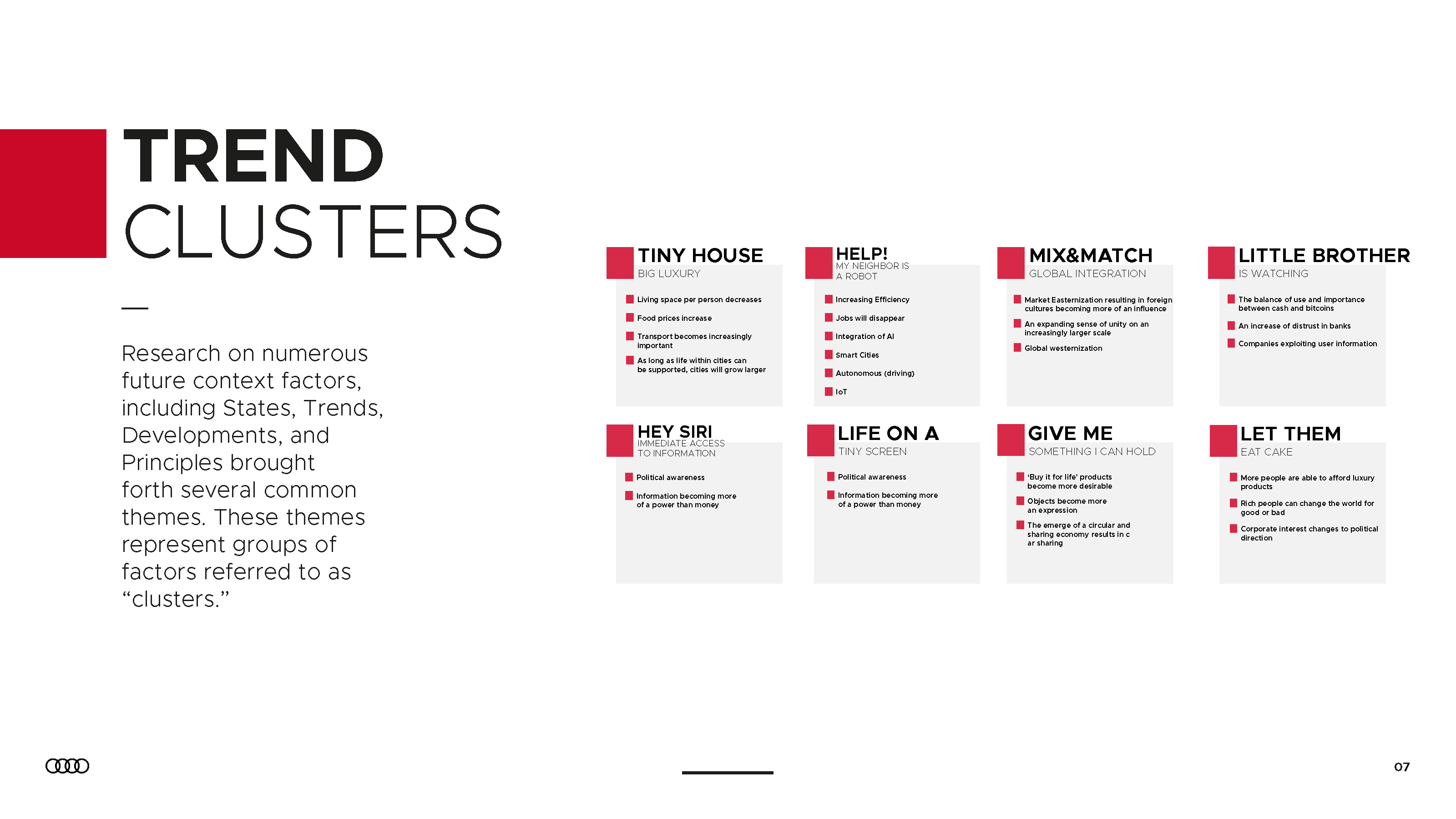 A diverging exercise where different trend clusters were made through brainstorm sessions with the team. The themes represent out-of-the-box future context factors applicable for the automotive industry.
