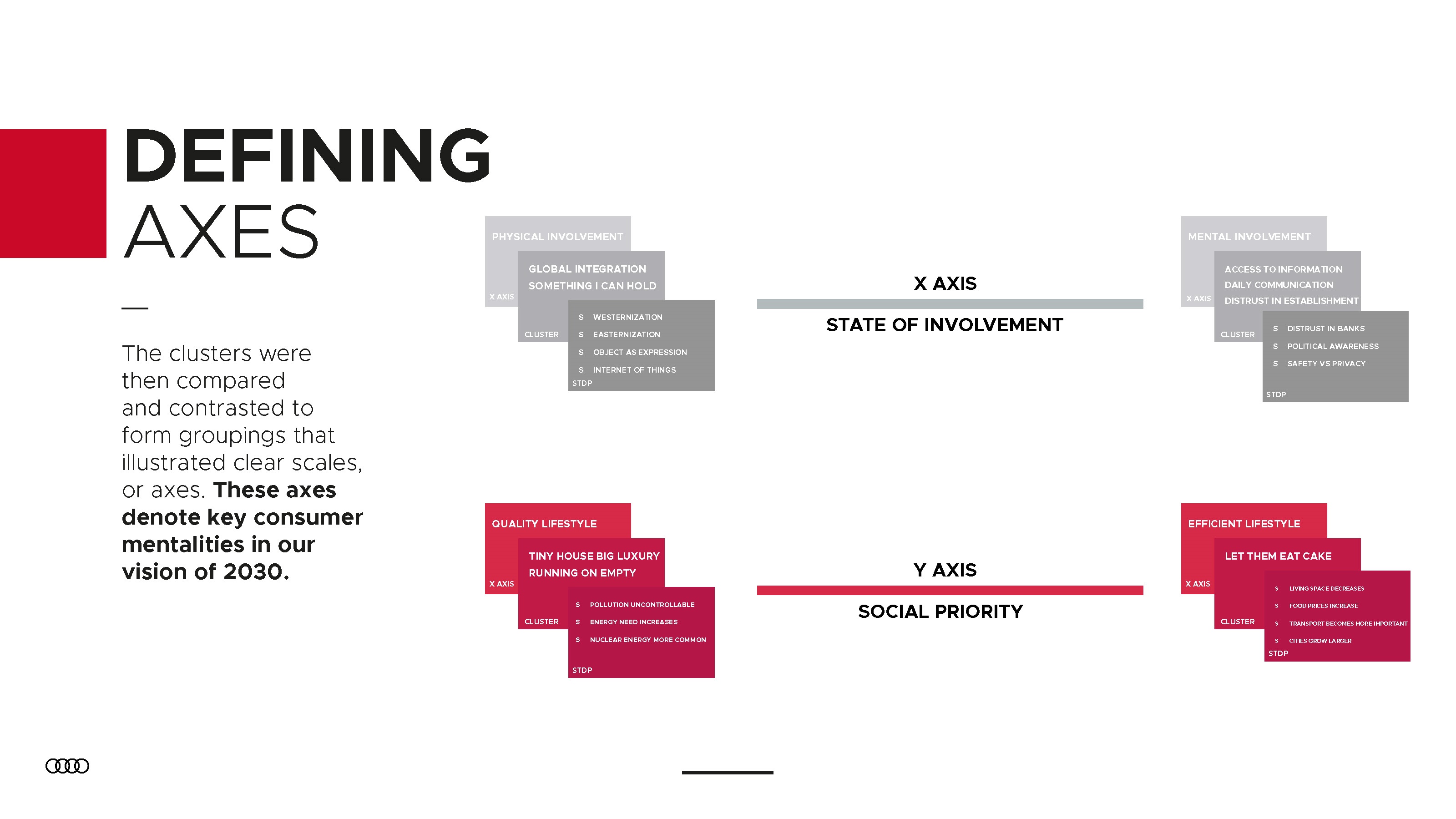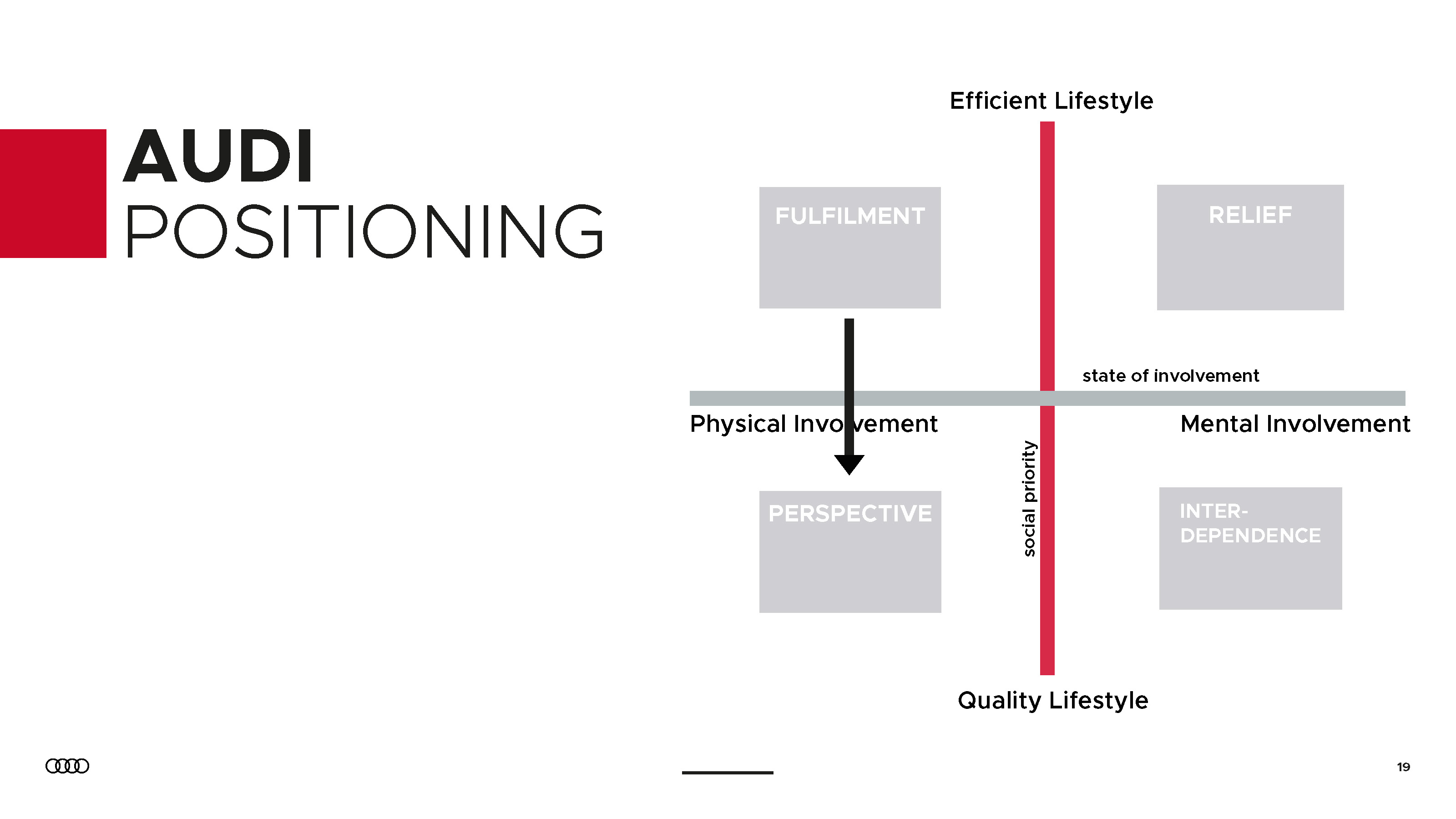 The positioning and axis highlight 4 quadrants that represent AUDI’s future consumer values. Fulfilment, Relief, Perspective and Interdependence.