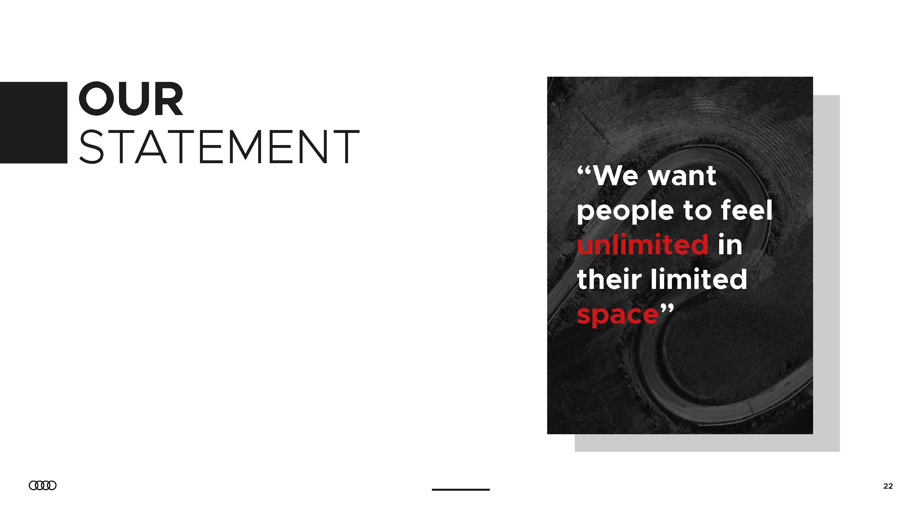 This statement gives a direction for the future, but does not restrict AUDI to be constrained by market threats as the EV Shift, urbanization or digitalization. Instead, the statement and brand positioning allows AUDI to spark opportunities in areas that AUDI can excel in, while focusing on creating a limitless feeling in the luxury automotive industry.