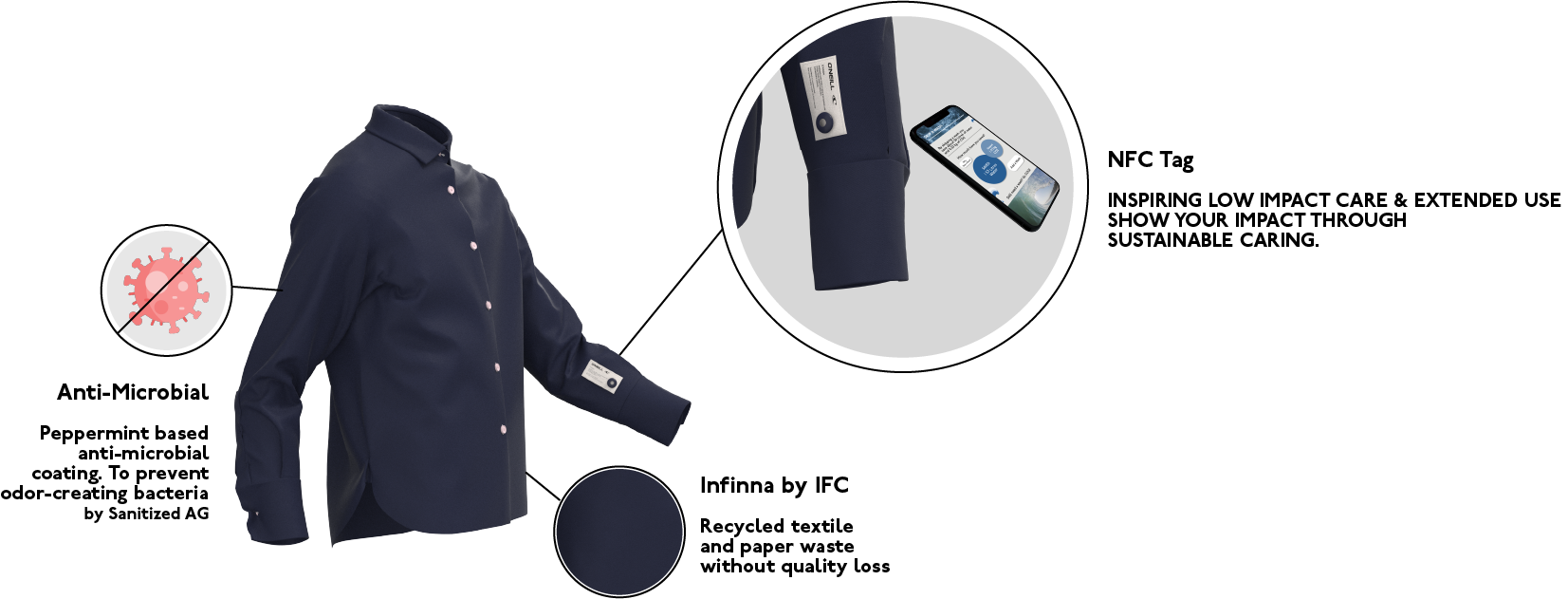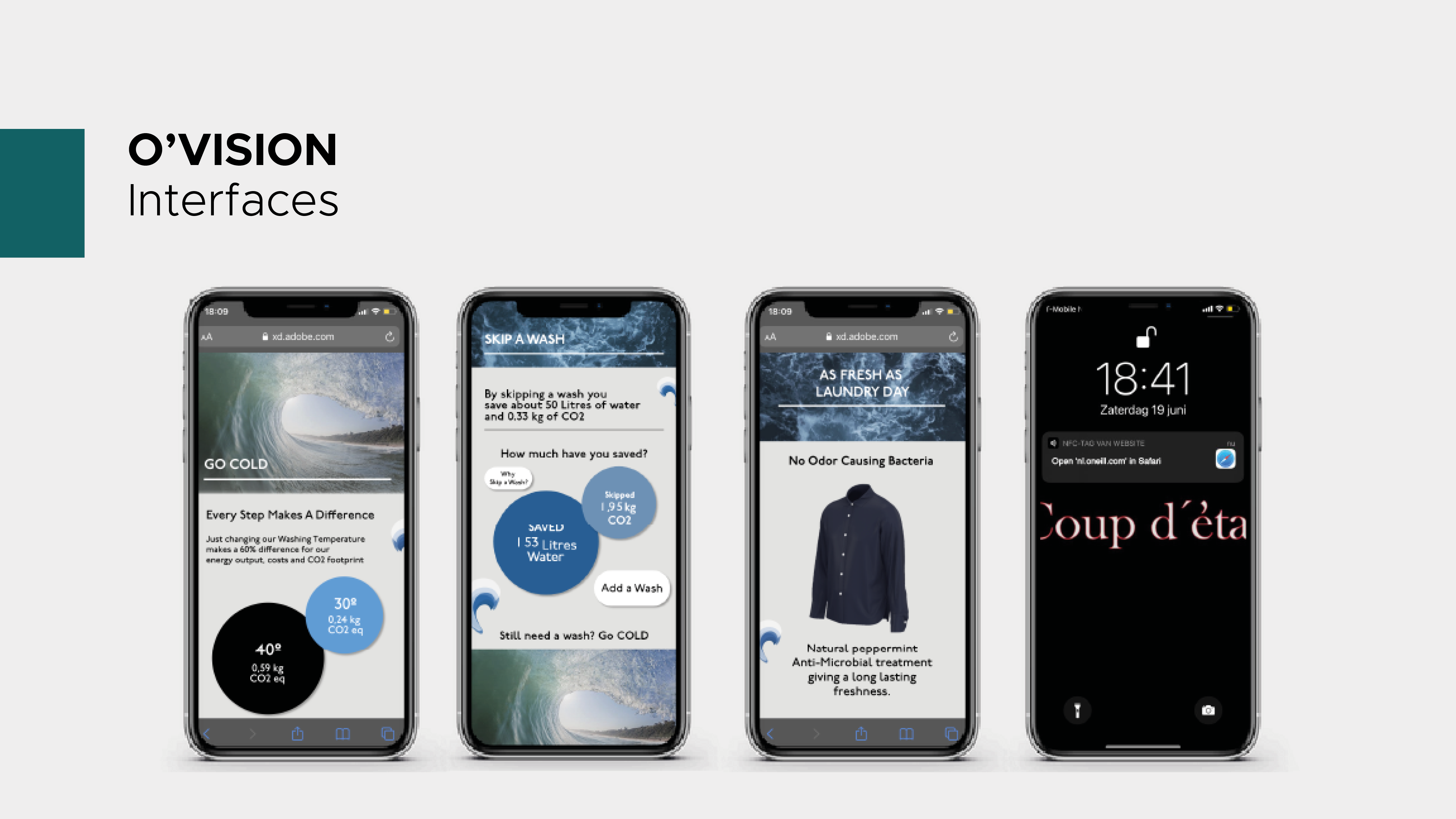 The concept O’Vision aims to bring transparency to a different level, showcasing the positive impact made in production processes of the garment, recycled materials, and coatings. Furthermore, it tries to spark sustainable behaviour by showing different care maintaining tips in order show the environmental impact it has in comparison to regular usage.