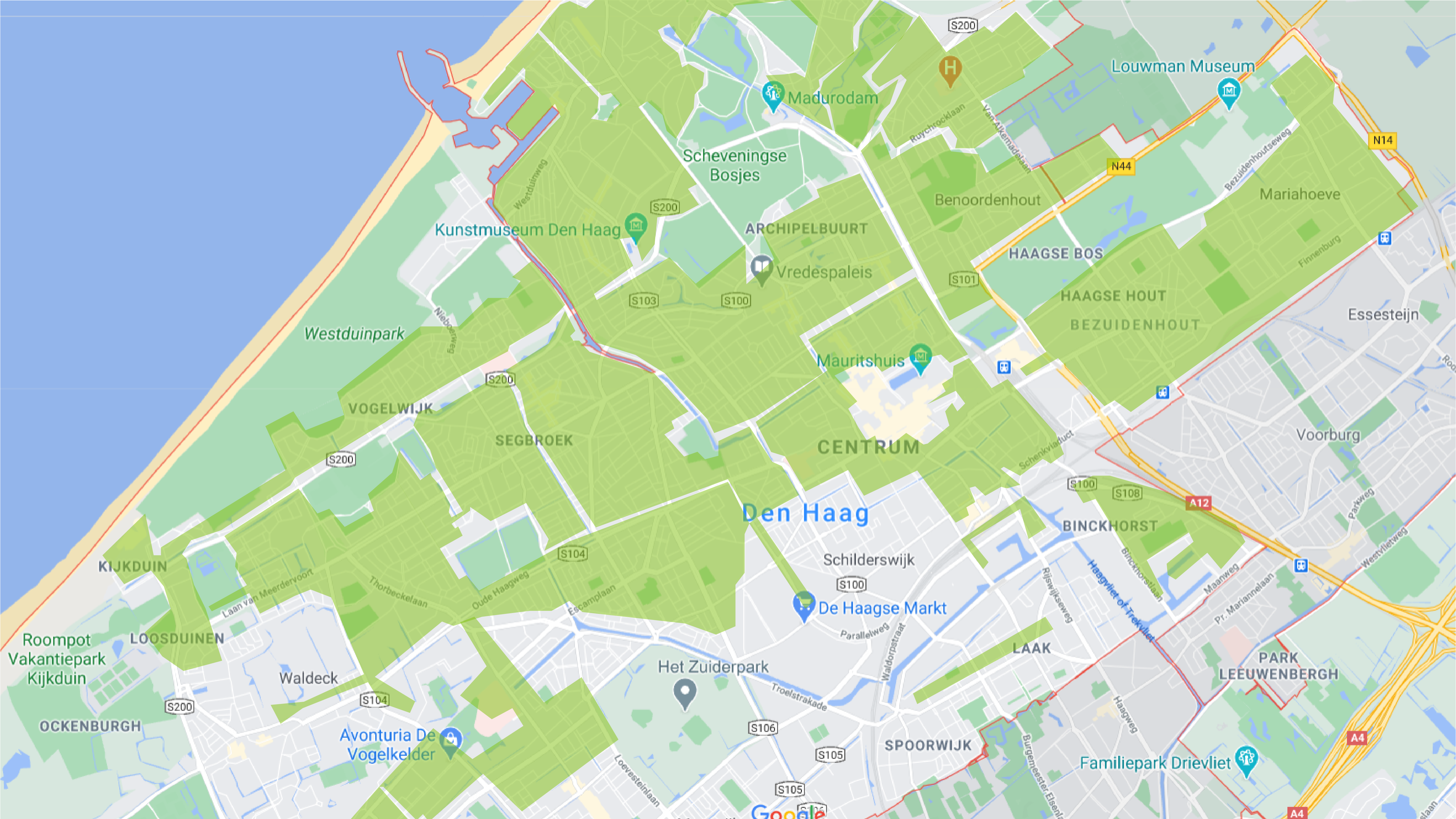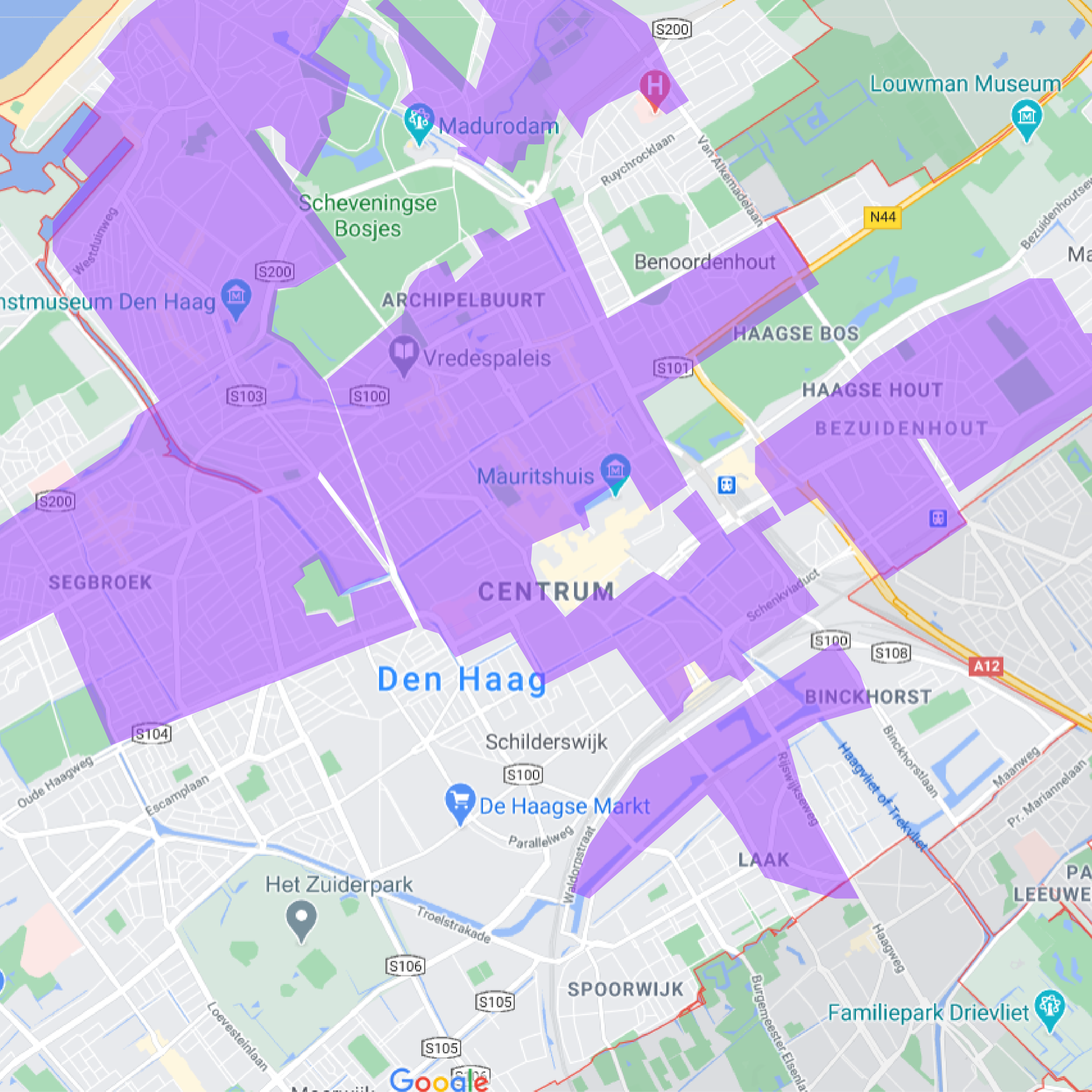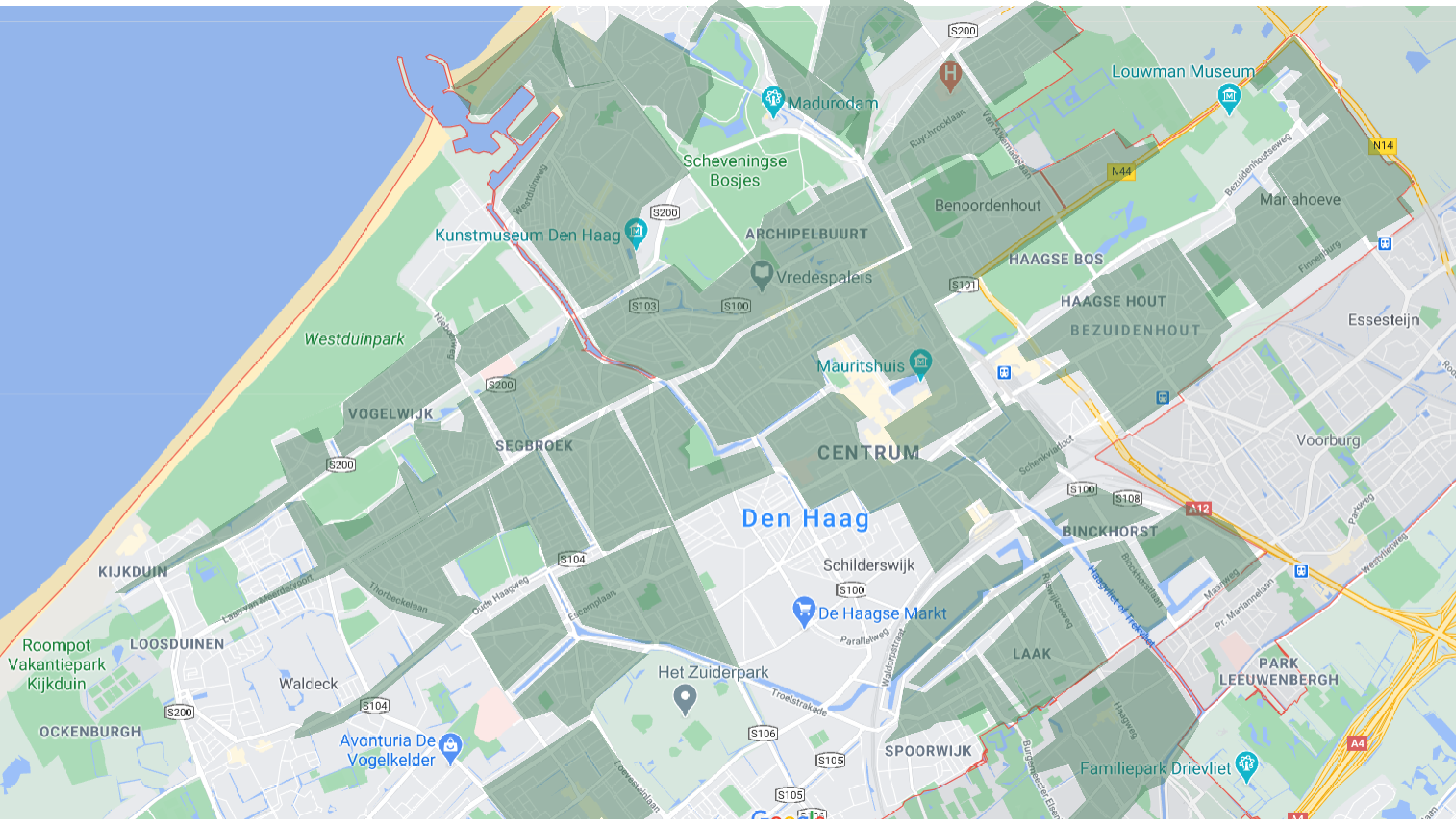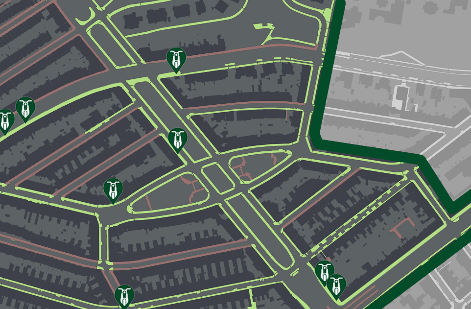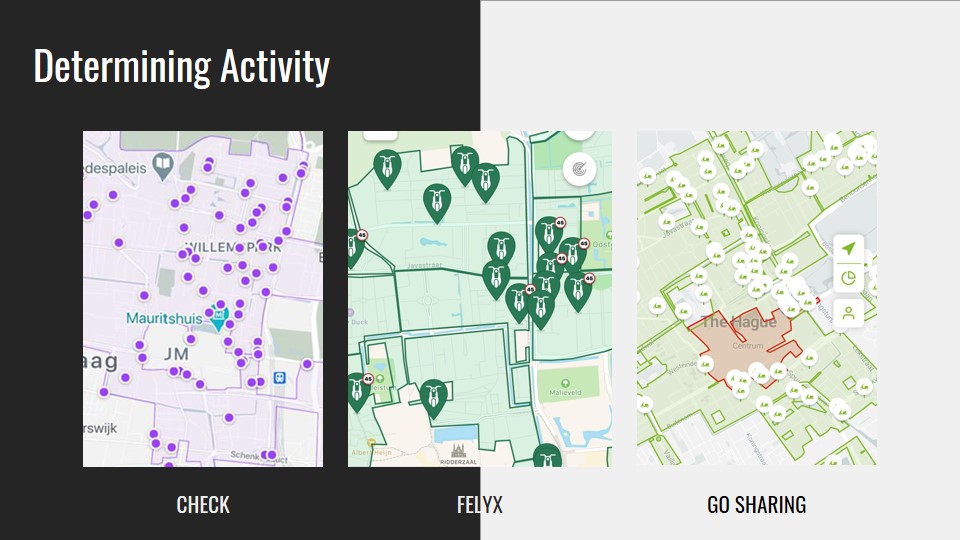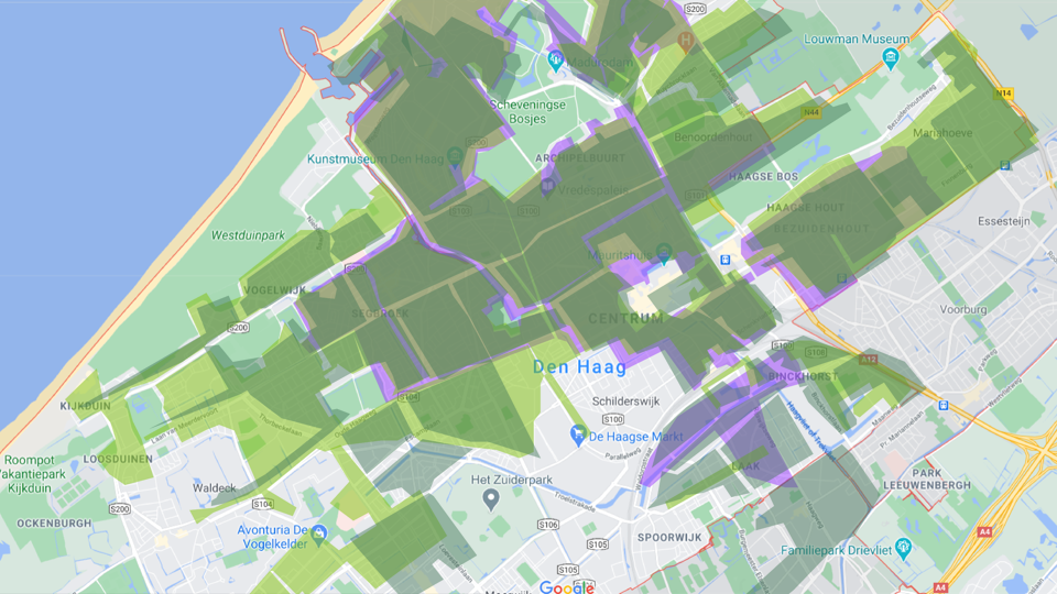 To understand the area of where wrongly parked scooters can be placed we have overlapped the active areas of all the shared scooter services in The Hague. Based on how the Check, GO and Felyx applications are set up, users of these services cannot end their rentals outside of these areas.