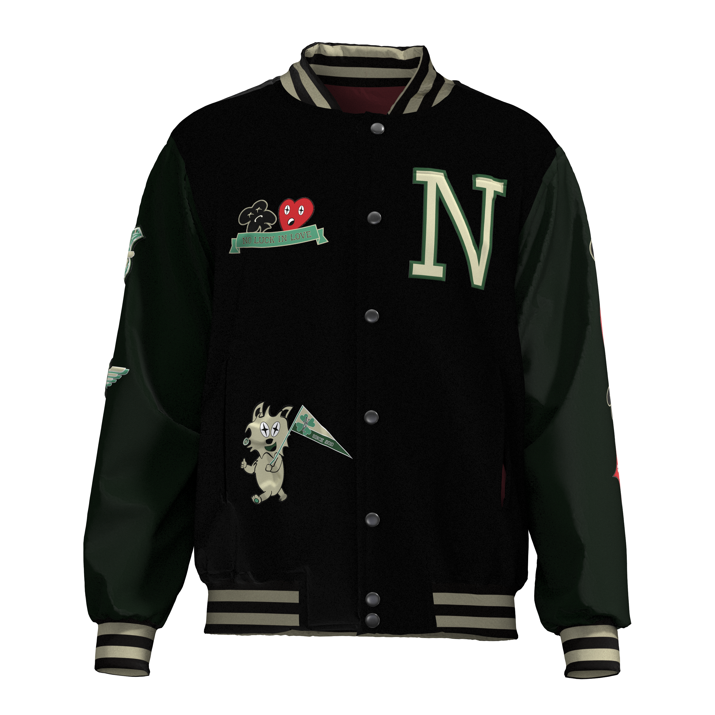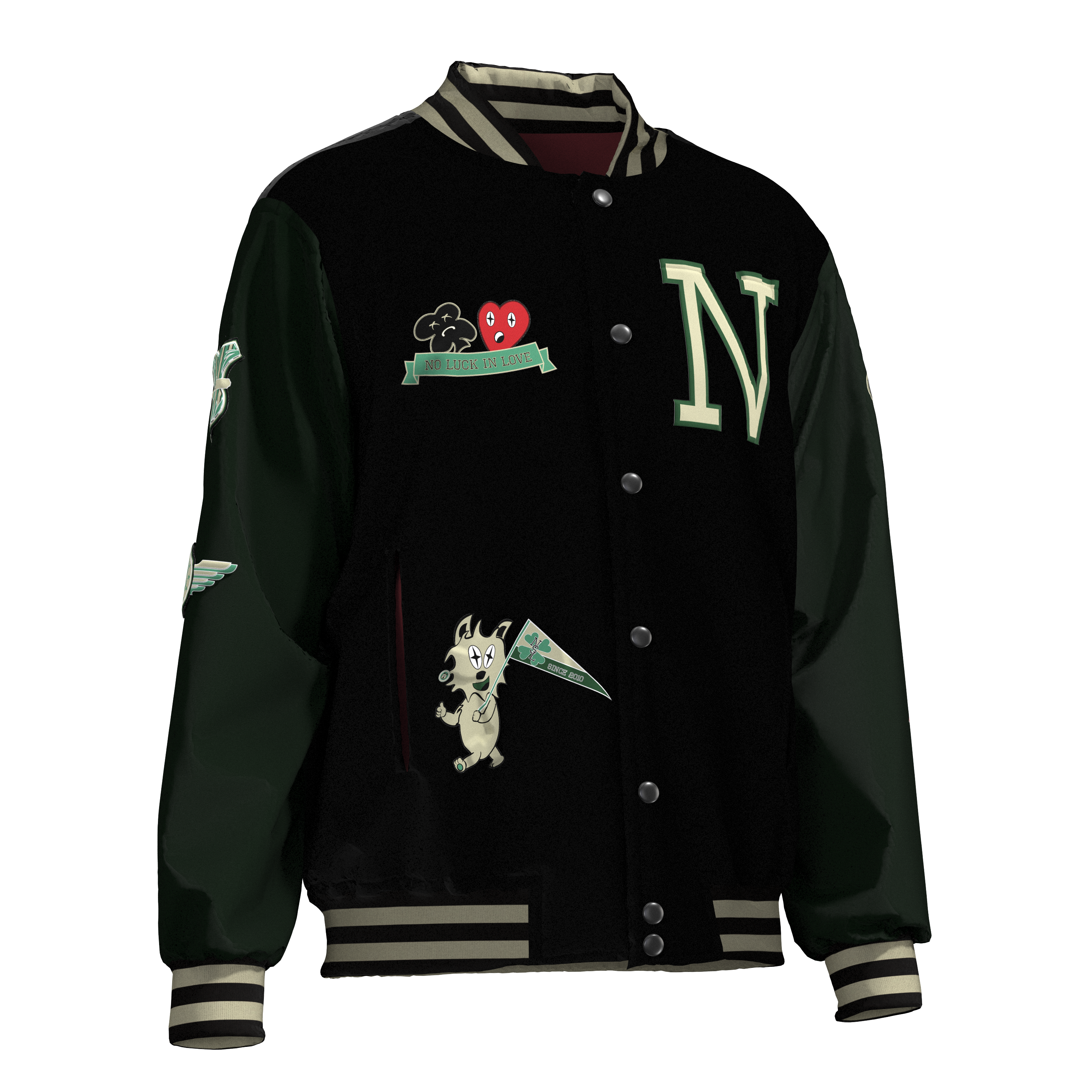 At the base of the collection Luck in Love and the collegiate-inspired theme, a 3D render was made with the software CLO3D. In this software I have added my graphic designs, to the varsity jacket to give the WeAreLabels team a good look and feel of the varsity jacket.